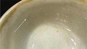 ※ 貫入や、ピンホールなどによるヒビや穴は 「割れ」 ではございませんので、ご使用に問題はありません。貫入と同様、色素の強い食品の汁気などが、シミとなって残る場合がございます。