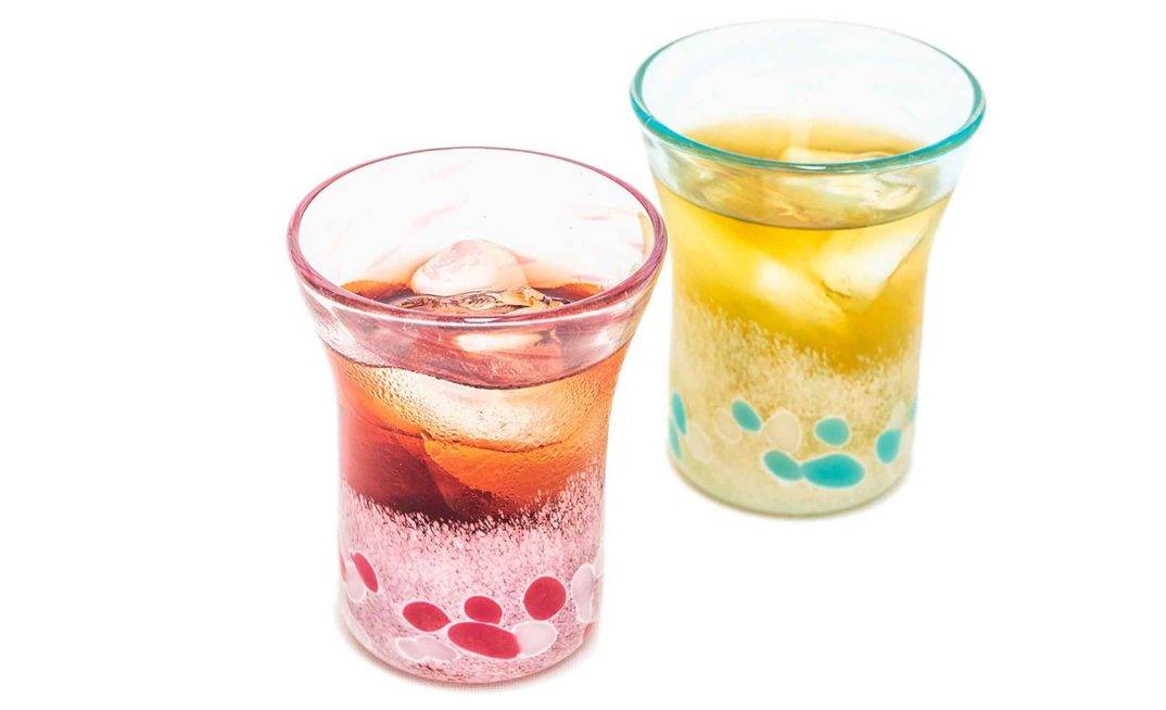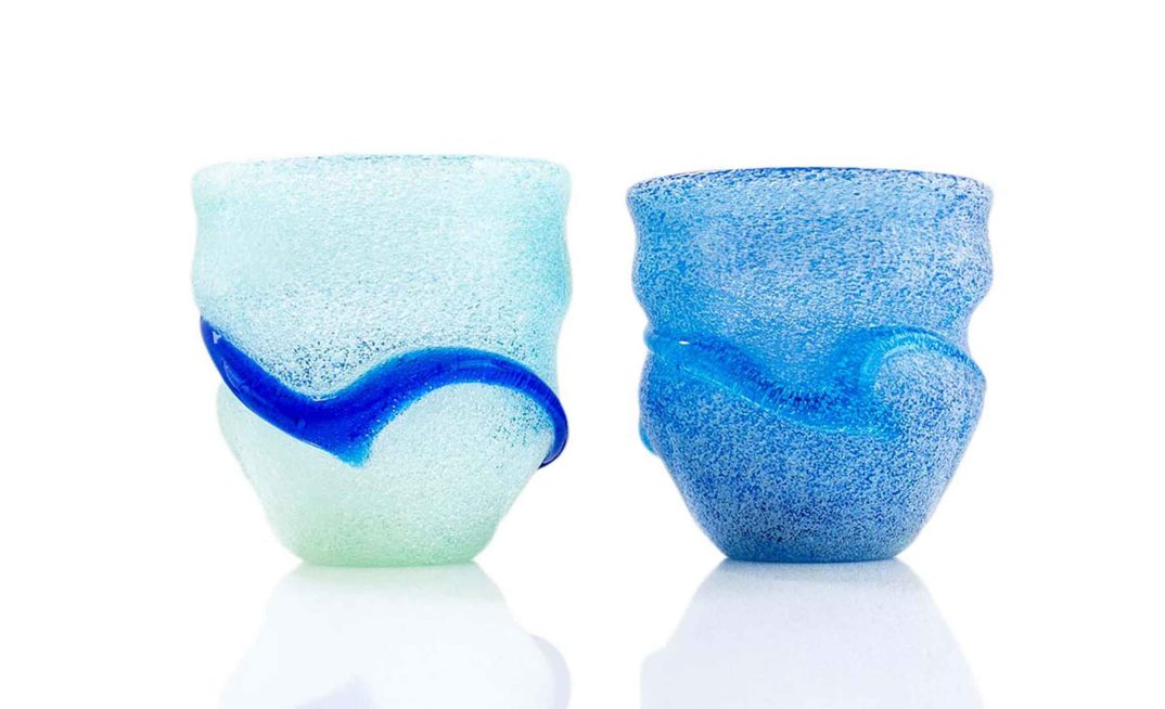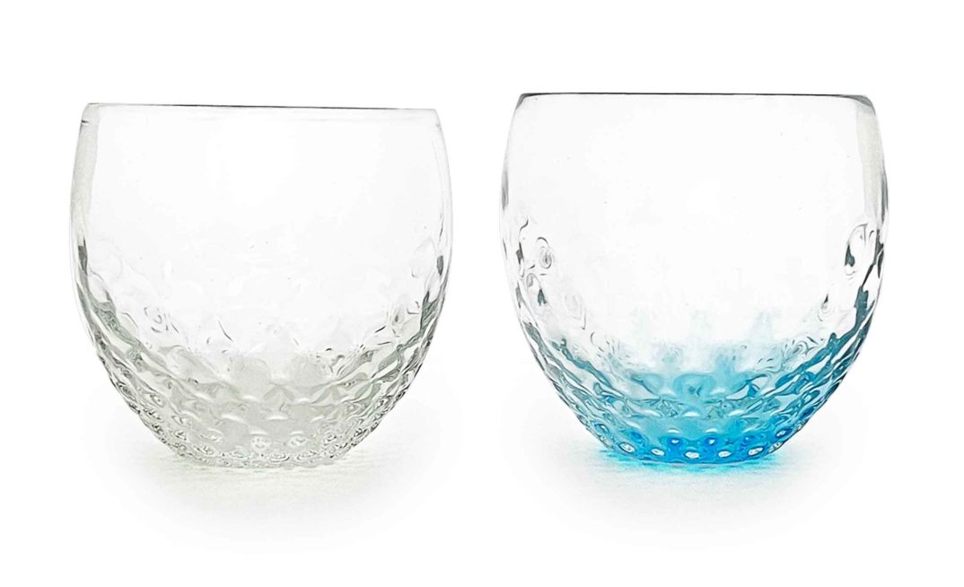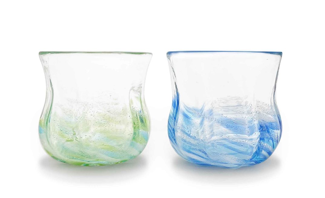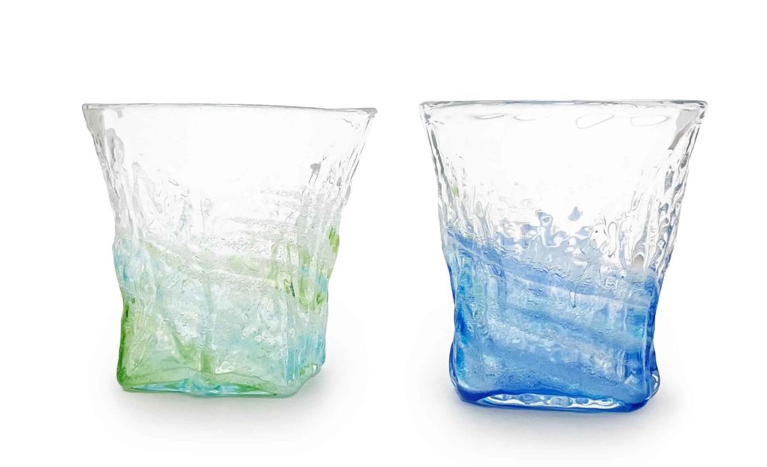縦に入ったモールとひょうたん型のフォルムが「ぽてっと」した柔らかい印象を与えるさざ波モールグラス、残波岬(読谷村)の岩肌を表現したグラス表面が特徴的な、さざ波残波グラス。「青と水色」「緑と水色」それぞれの色がバランス良くミックスされ、沖縄らしい海を演出しています。小ぶりなフォルムが使いやすい万能グラスです。