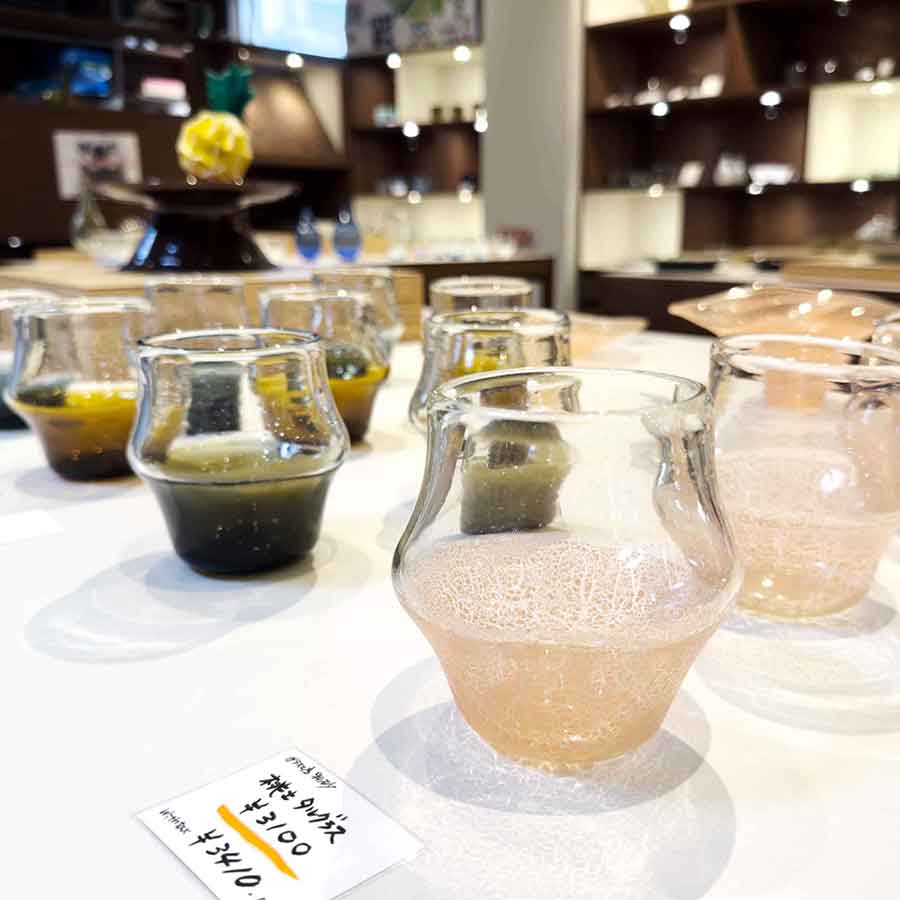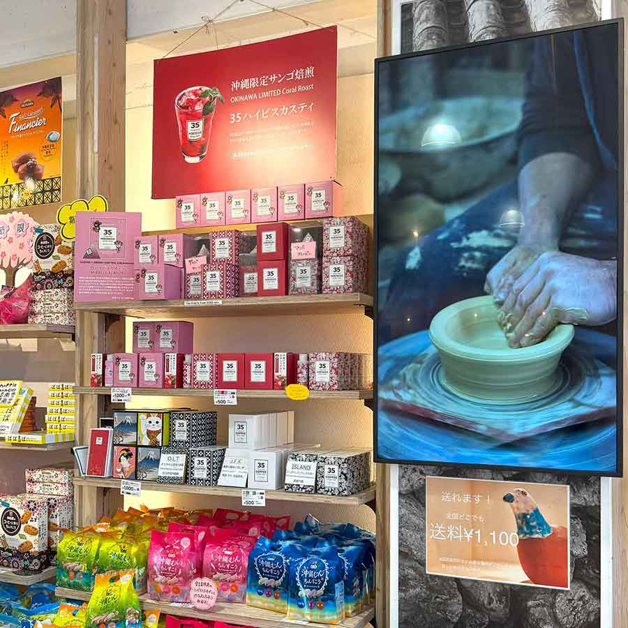 くもじ店 は、那覇のメインストリートである国際通りに位置する100坪の広いお店です。ベビーカーや車椅子が通りやすい通路設計となっています。また、豊富な商品数と見やすい陳列が特徴です。定番土産のお菓子や泡盛はもちろん、琉球ガラスや陶器(やちむん)をはじめとする沖縄の伝統工芸品も充実しています。